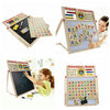 Are 5 functii: tabla neagra (creta si burete incluse); tabla magnetica (markerul, literele si cifrele incluse); numaratoare/socotitoare/abac; ceas cu limbi mobile hexagoane pentru calculat (toate cele 4 operatii matematice)